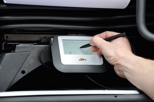Ein Entgegenzeichnen auf dem Tablet sorgt für effizientere und umweltbewusste Geschäftsprozesse ohne Papier und Ihre Wiegedaten werden sofort für die Verwaltung weiterverarbeitet. Am Unterschriftentablett, das praktisch und leicht erreichbar seitlich des Fahrersitzes platziert wird, kann die Unterschrift des Kunden sofort entgegengenommen werden. Dies erleichtert vor Ort die Abwicklung ohne Papier, außerdem ist eine individuelle und exakte Auswertefunktion gegeben. Die ultrahellen Matrix-Anzeige-Elemente zur Gewichtsanzeige, kann man auch bei direkter Sonneneinstrahlung gut abgelesen. Sollte eine Datenspeicherung oder Weiterverarbeitung von Stammdaten gewünscht werden, so sind diese auf dem integrierten LC-Display dargestellt.